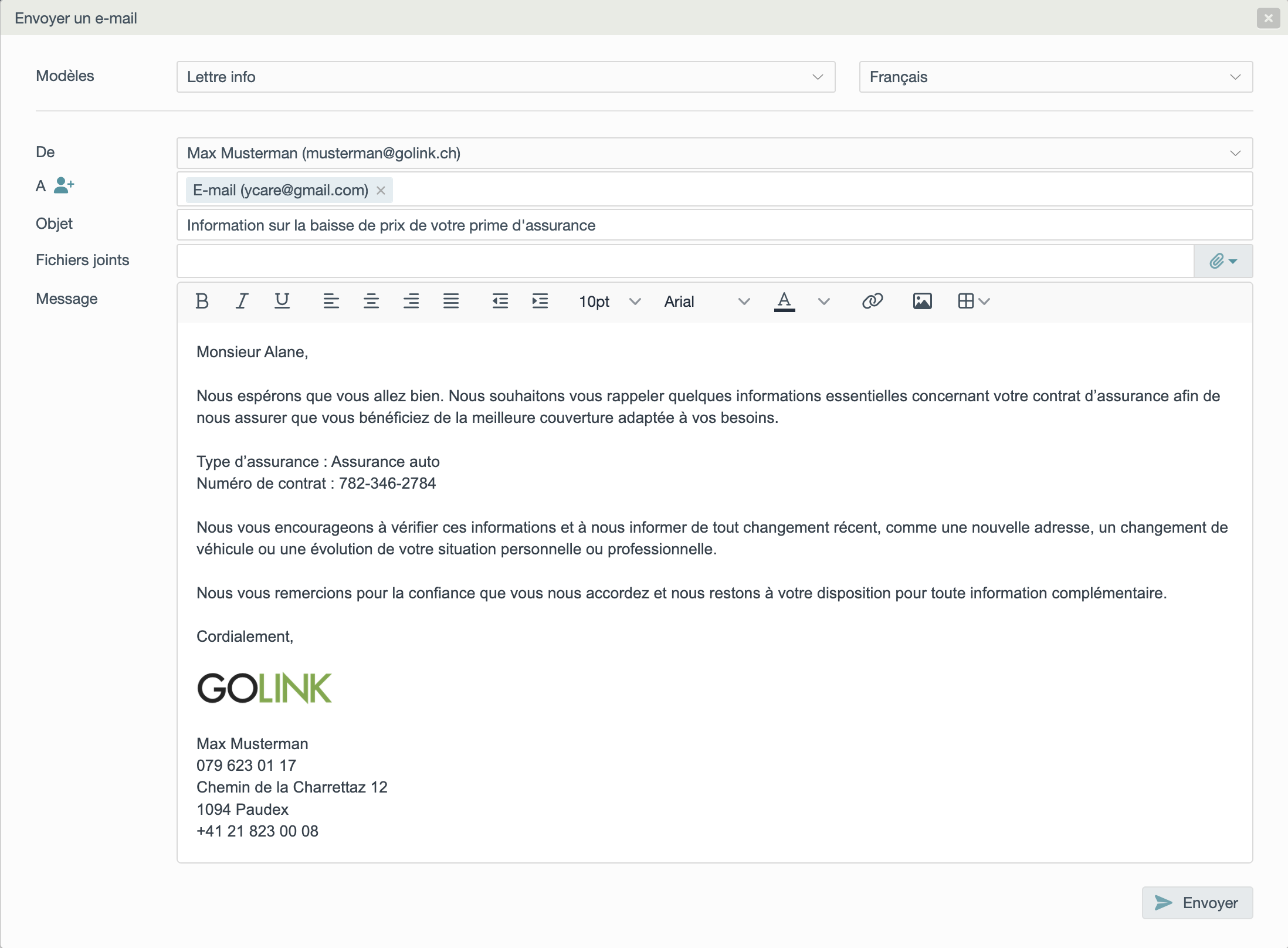 Cher client, Nous vous informons que votre contrat d'assurance a été activé. Avec nos meilleures salutations. GOLINK SA